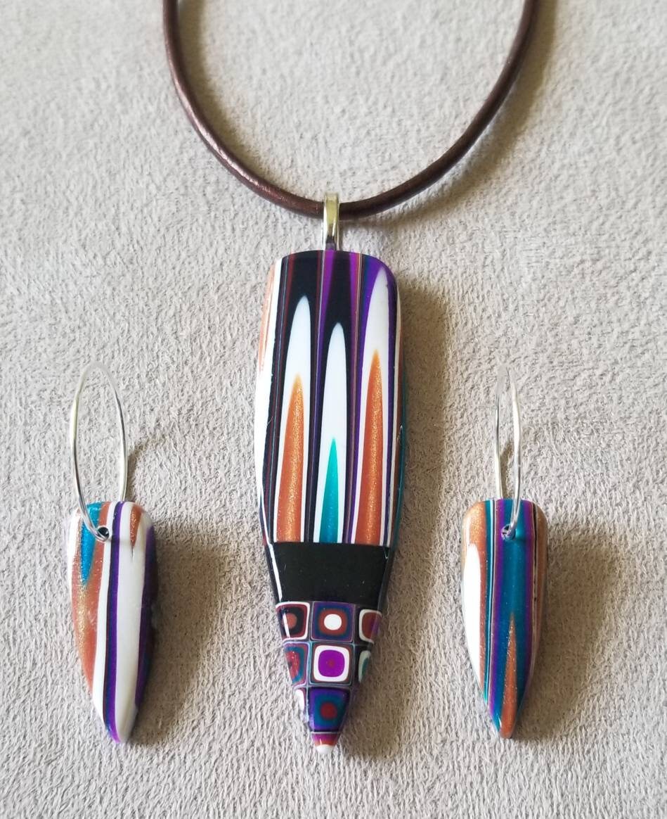 Pendant measures 2 1/4" long x 5/8" wide. Earrings measure 1 5/8" long with hoop. The pendant hangs from 18" leather cord with lobster claw clasp.