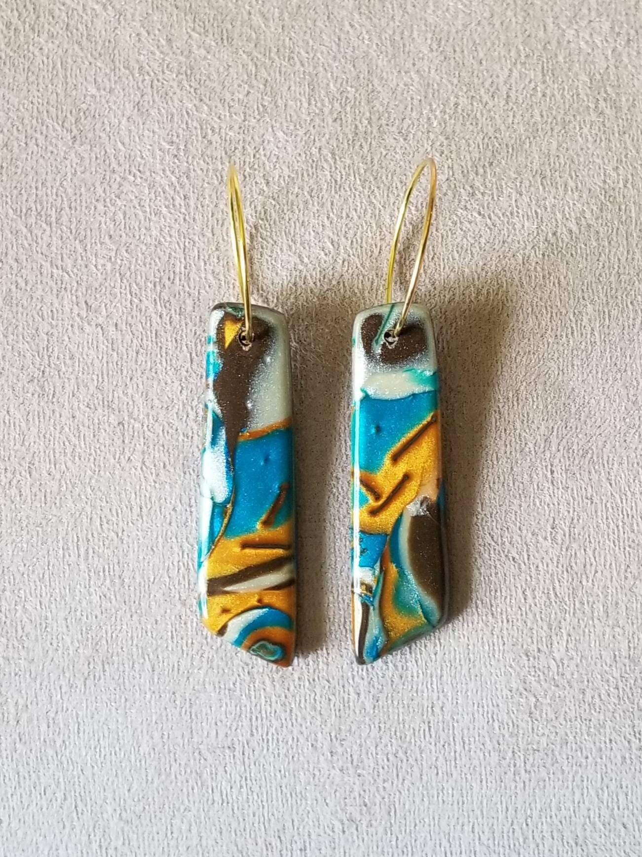 Mokume Gane - Mia Statement Earrings - Teal, Gold, and Dark Brown, #2